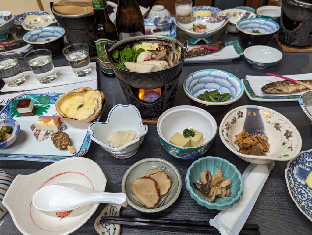 Despite its remote location, Kaniba Onsen surprises guests with an unparalleled dining experience. The cuisine is highlighted by fresh, locally sourced mountain delicacies (Sansai), including the famed Iwana (char) grilled over fire and hearty regional stews. This generous spread, featuring traditional mountain vegetables and river fish, elevates the stay from simple lodging to a genuine cultural retreat. Be sure to sample the local sake flight, including regional specialties like “Kariho,” “Takashimizu,” and “Ranman,” which perfectly complements the mountain feast.